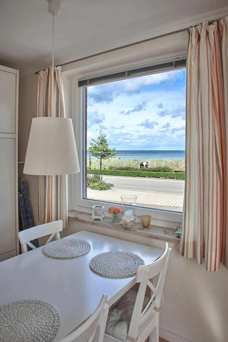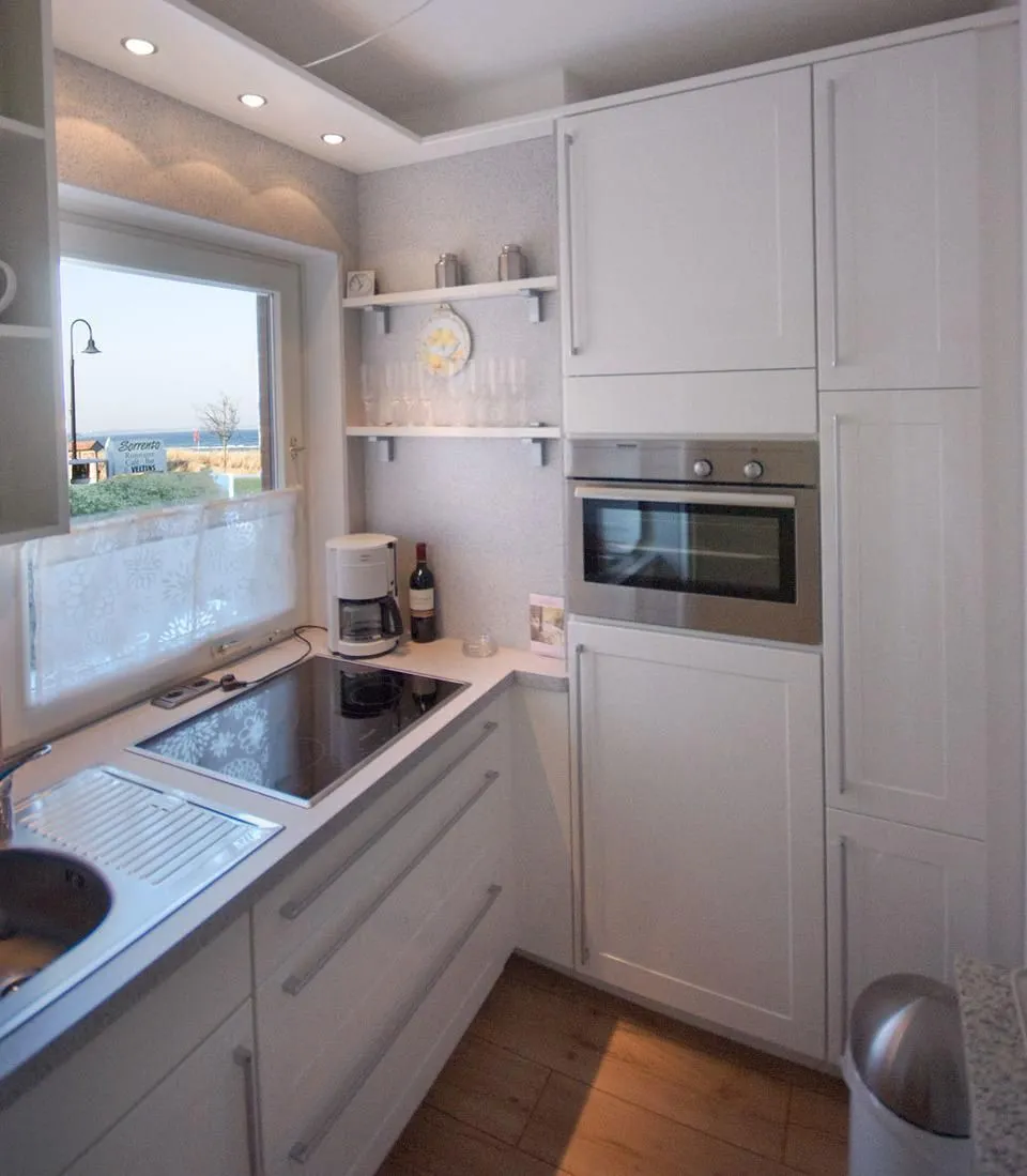 Diese gemütliche Ferienwohnung bietet ein Ess- Schlafzimmer mit einem großen Esstisch am Fenster mit Blick auf das Meer und ein komfortables Doppelschrankbett mit 2 Matratzen. Das gemütliche helle Wohnzimmer ist mit einem bequemen Dreiersofa ausgestattet. Meerblick genießen Sie außerdem aus der kleinen, modernen, voll ausgestatteten Einbauküche inkl. Ceranfeld, Ofen, Kühlschrank mit Gefrierfach, Kaffeemaschine, Wasserkocher.