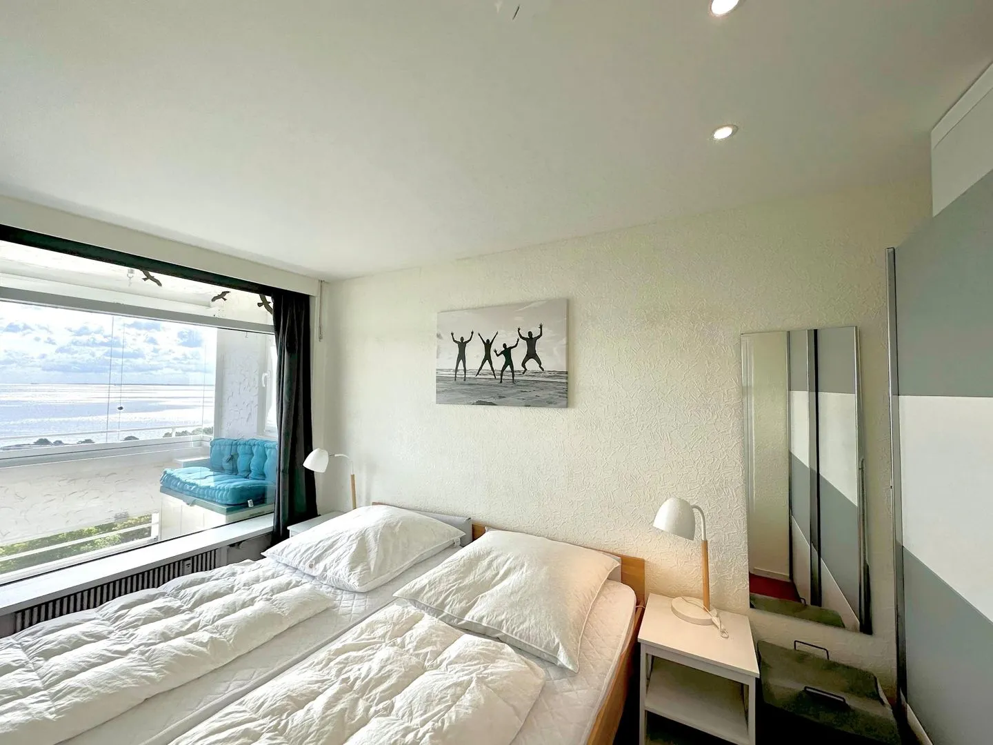 Das Schlafzimmer hat für jeden Bettseite einen eigenen Eingang. Auch aus diesem Zimmer können Sie den traumhaften Meerblick genießen. Ein großer Kleiderschrank steht für Sie bereit. Der Schlafbereich verfügt über ein Verdunklungsrollo.