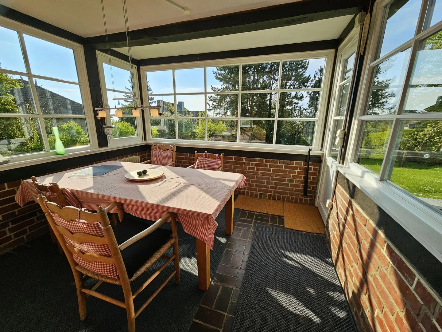 Das Esszimmer ist im komplett verglasten Veranda-Anbau untergebracht.