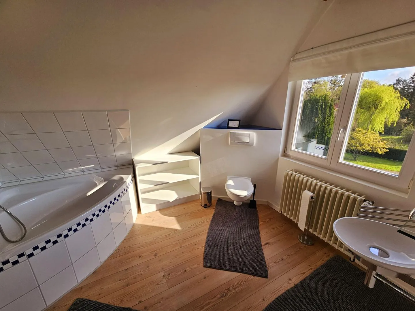 Im Obergeschoss finden Sie ein Badezimmer mit Dusche und Eckbadewanne sowie WC und Waschbecken vor.