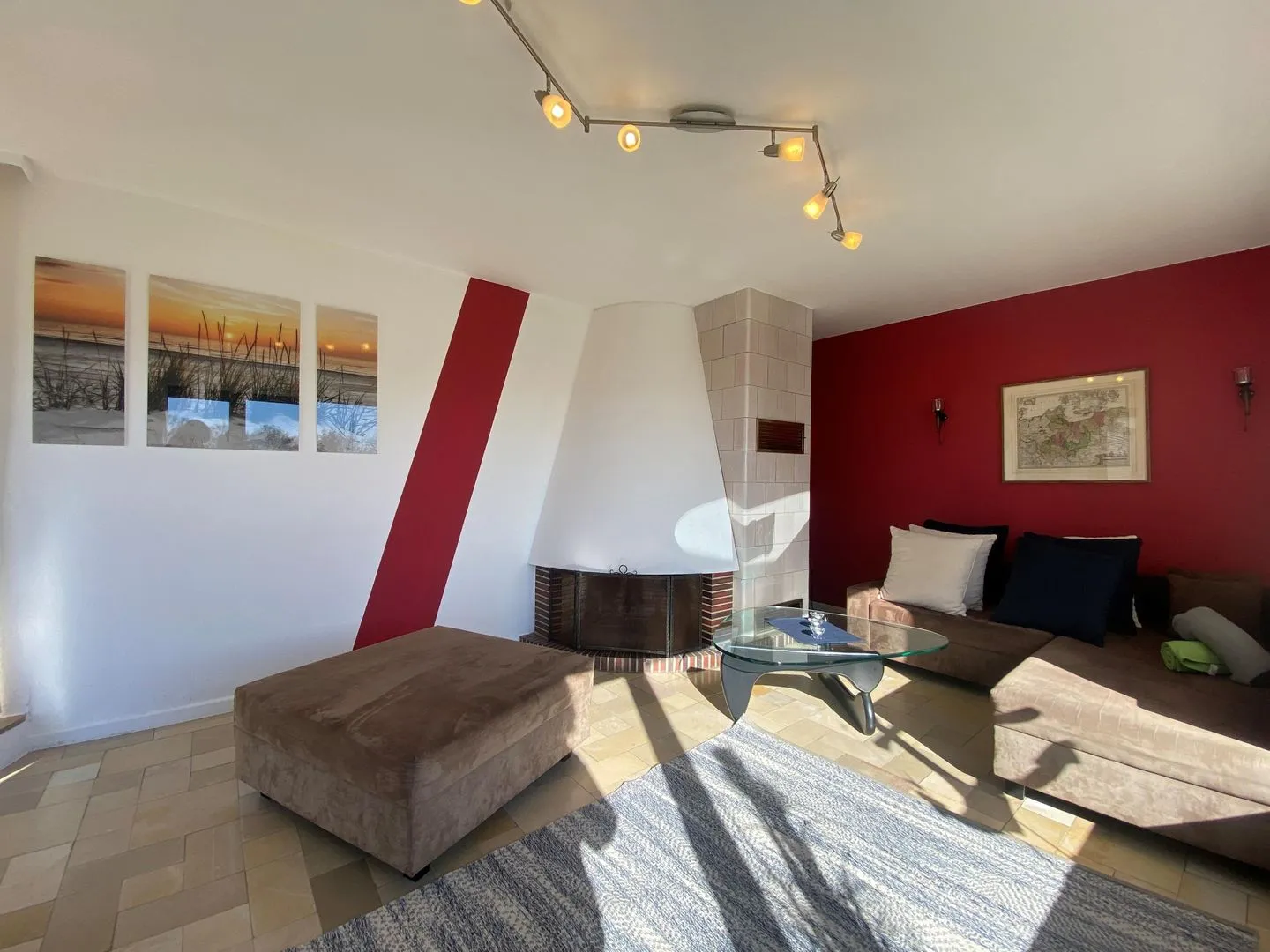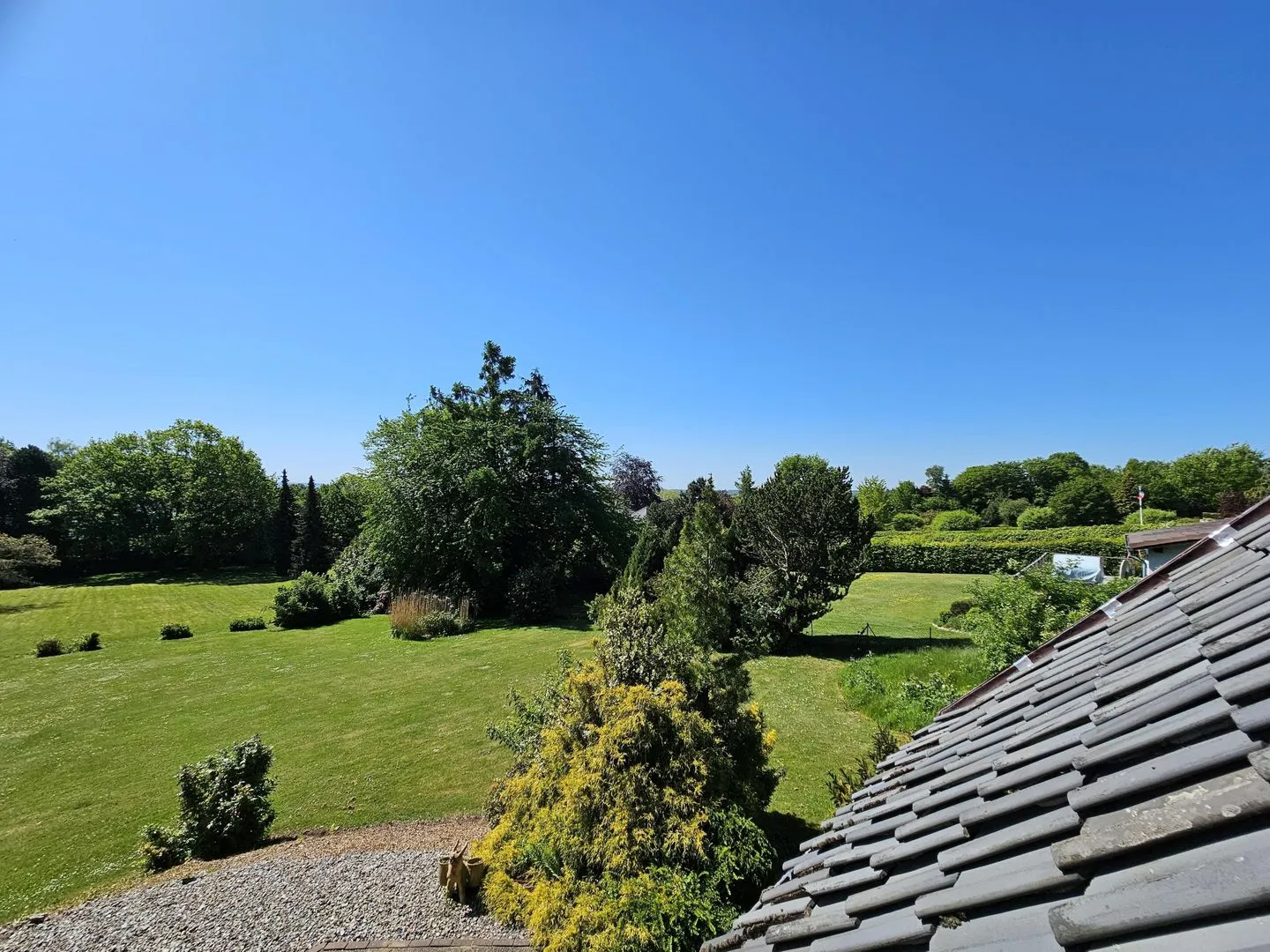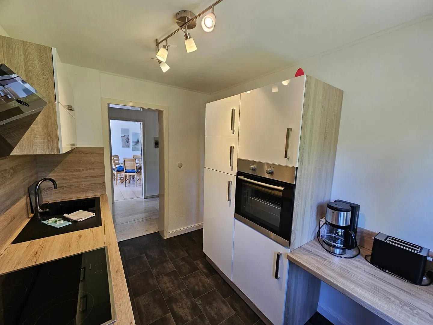 Im Erdgeschoß befindet sich ein Gäste-WC, eine neue Küche mit Spülmaschine, Backofen, Herd, Kühlschrank mit Gefrierfach, ein großer Abstellraum, sowie ein großzügiger Wohnraum mit offenem Kamin und einem Essbereich. Vom Wohnzimmer und dem Essbereich bietet sich ein Panoramablick in den großzügigen Garten und im Frühjahr bis zur Ostsee.
