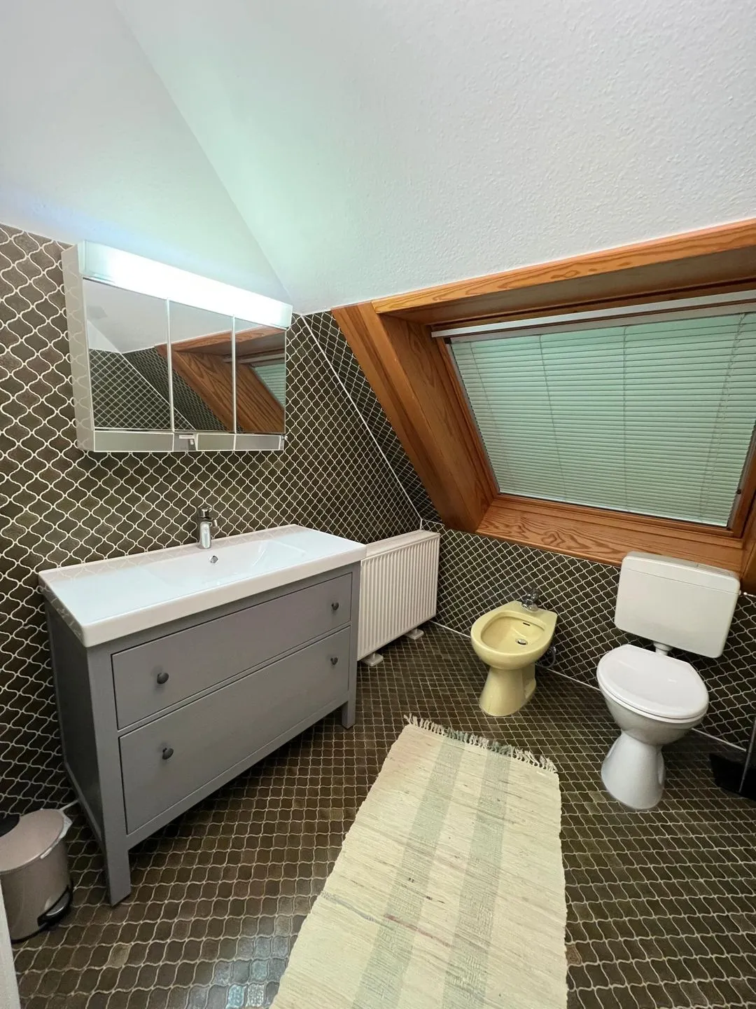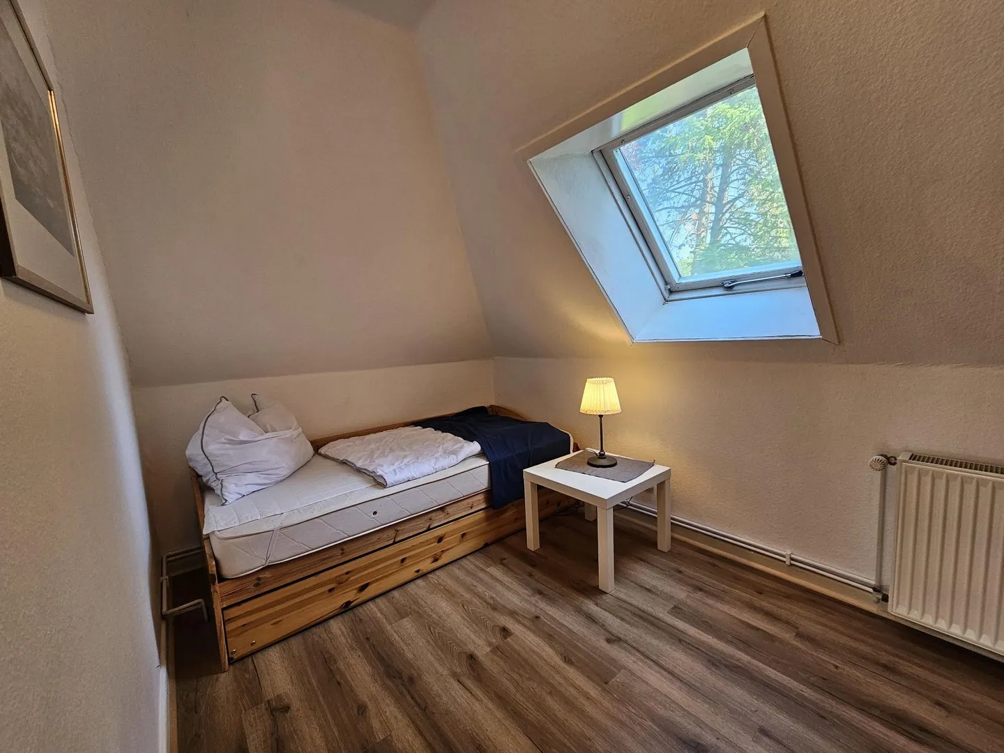 Das Ferienhaus ist im Obergeschoß aufgeteilt in drei Schlafzimmer (2x Doppelbett, 2 x Einzelbett (1 x ausziehbar)) und ein Bad mit Dusche, Badewanne, Bidet und Waschbecken.