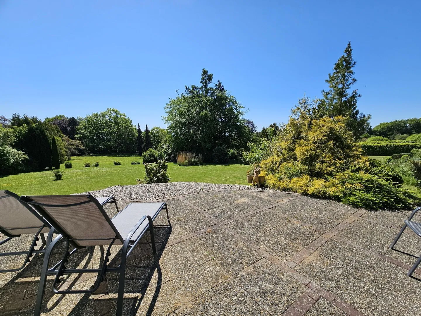 Eine große, teilweise überdachte Terrasse ist mit einem Tisch, sechs Stühlen und zwei Sonnenliegen ausgestattet. Der Wohn- und Essbereich ist mit Stühlen, Kinderstuhl, Tisch, Sofa, Glastisch und einem Kamin ausgestattet.