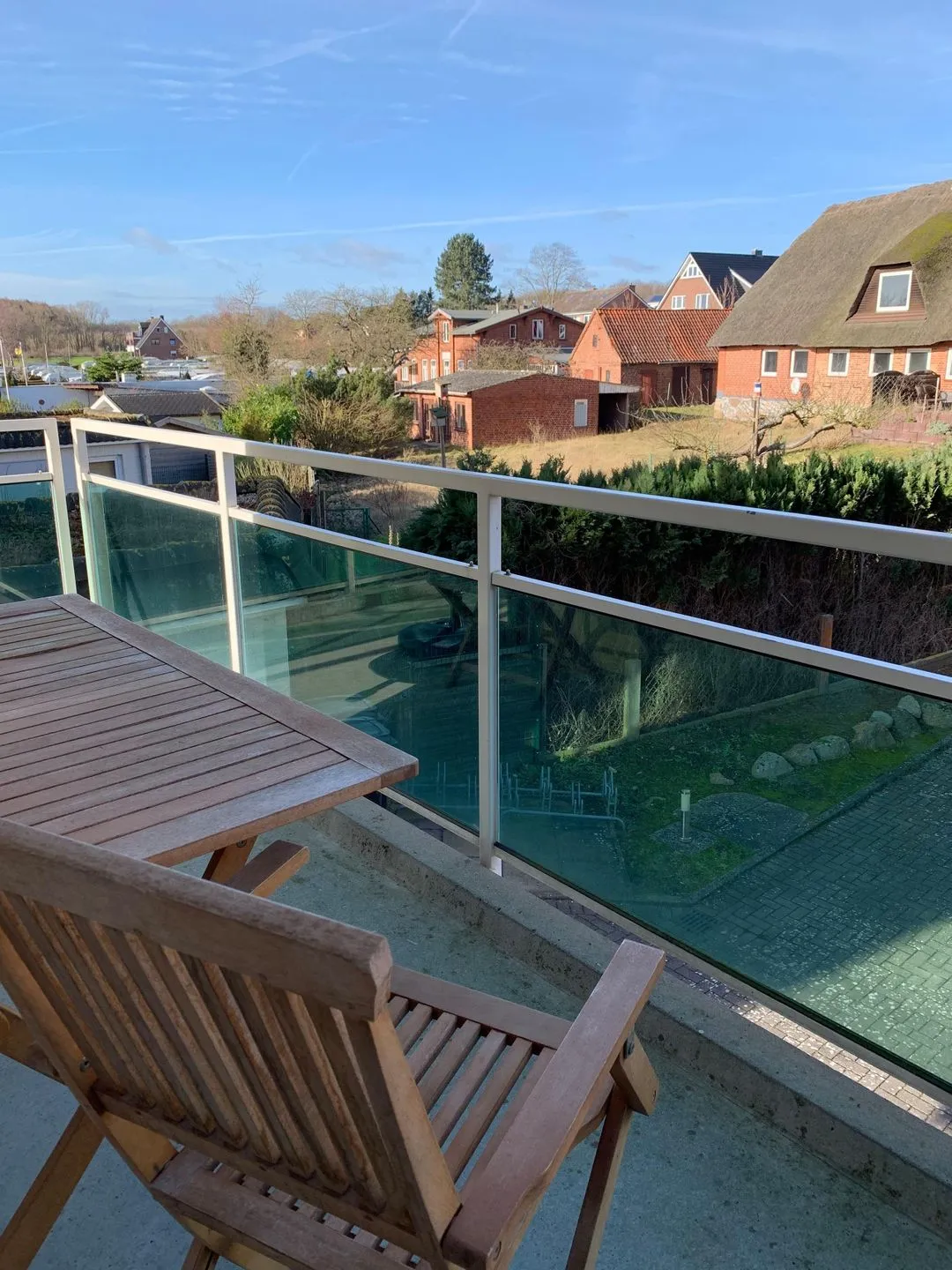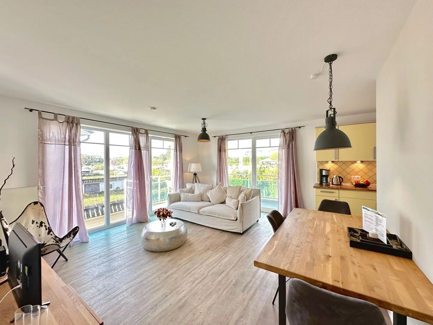 Das modern eingerichtete Wohnzimmer verfügt über einen Flachbildfernseher und eine Stereoanlage. Von dem angrenzenden, möblierten, seitlichen Balkon haben Sie einen schönen Blick auf die Ostsee.