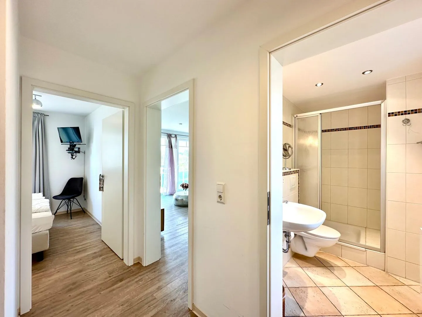 Die Wohnung verfügt über einen kombinierten Wohn- und Essbereich, ein Schlafzimmer mit Doppelbett und ein helles, Duschbad mit Fußbodenheizung und Fenster.