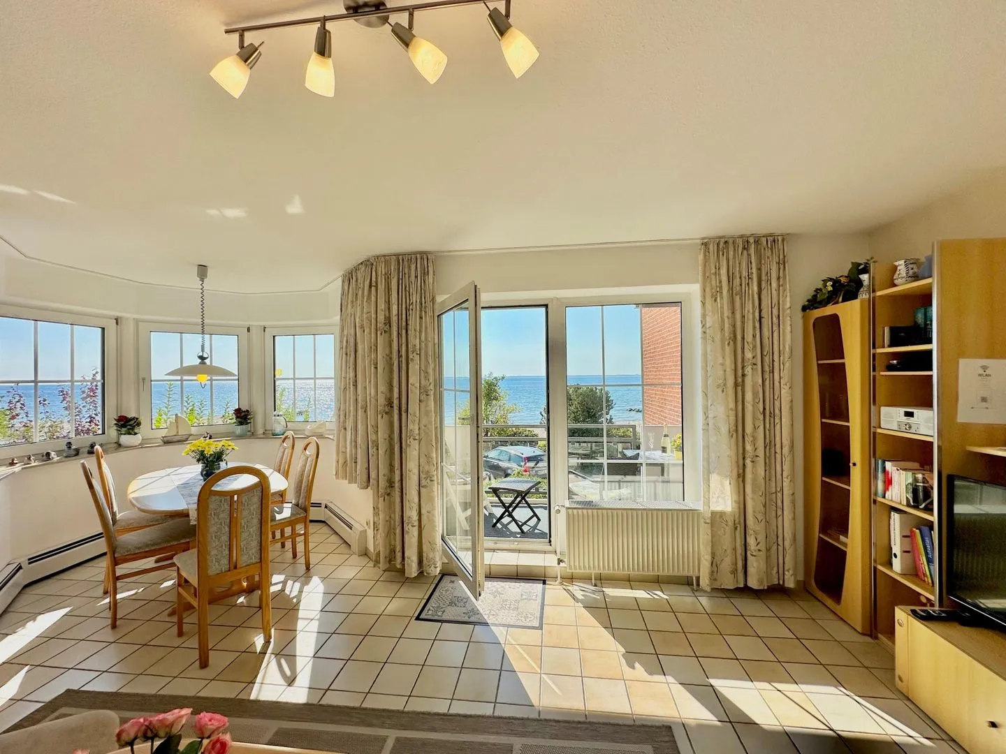 Das Wohnzimmer verfügt über eine Loggia in Süd-Lage mit traumhaften Ostseeblick. Ein HD-TV und HD-Sat-Receiver, DVD-Player, USB-Ladestation und ein Radio stehen zur Verfügung.